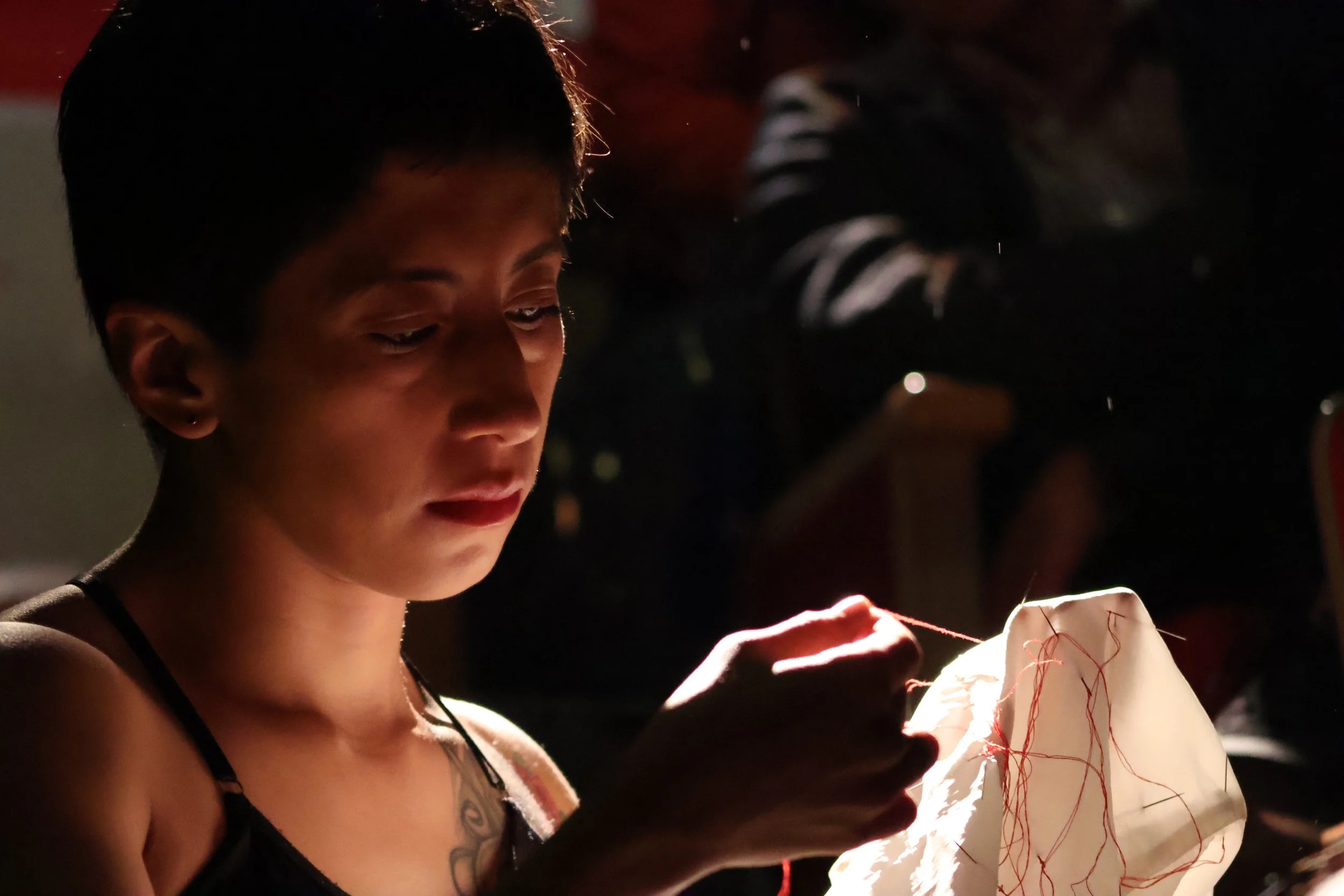 El hechizo como una acción dispuesta en el escenario, se expresa en acciones fragmentarias, rotas. La operación, el dispositivo, finalmente, hace uso de estos elementos de la técnica: la video proyección, el fotobordado, el audio documental, las máquinas de coser, los micrófonos y sobre todo el exigente desempeño de los intérpretes, para invertir la ausencia del rito, el estigma de la obra terminada y sus caminos polisémicos.