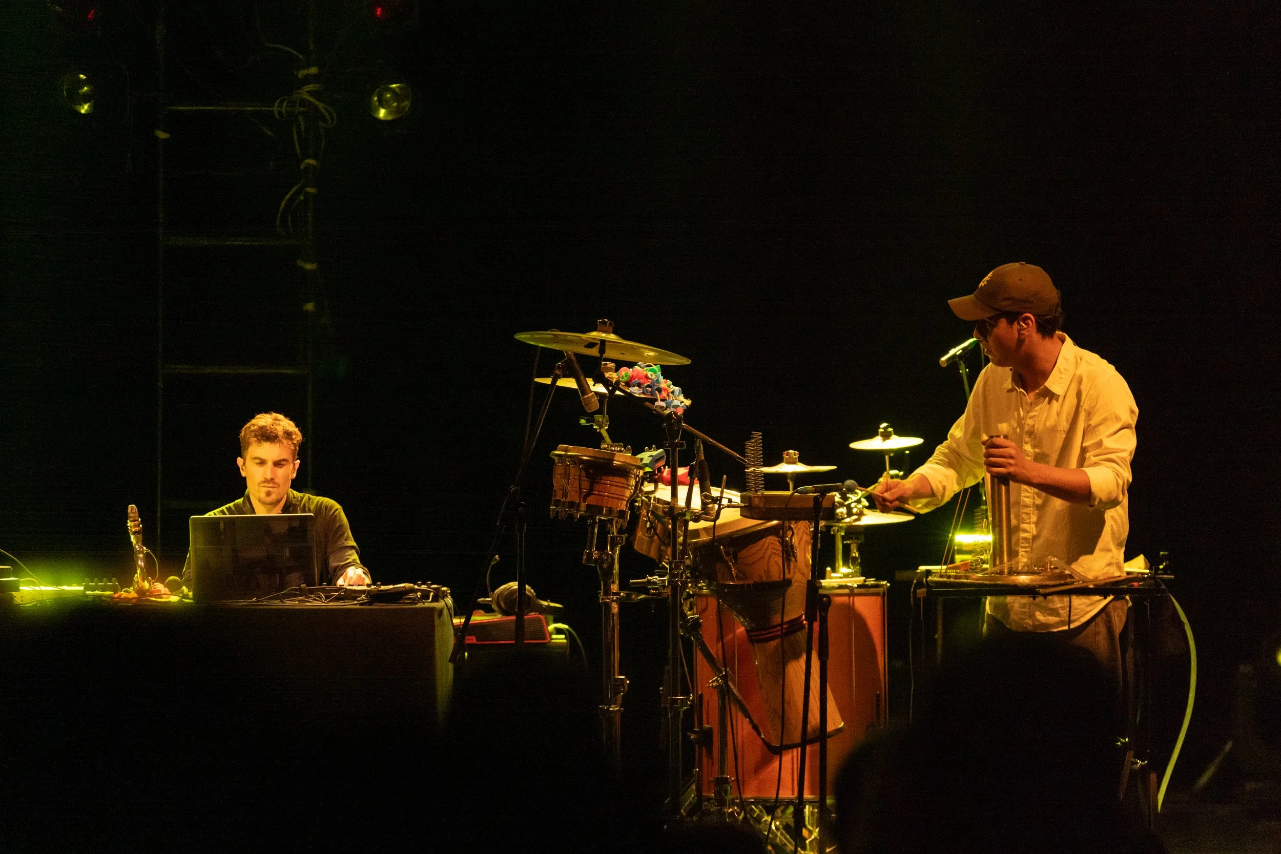 Arranca la primera pieza reconocible: Piedras. Sobre un patrón de pizzicato de violín y tambores secos, entra un teclado envuelto en olas electrónicas: soplos de aire frío, vientos sintéticos. La percusión en vivo dota a la pieza de una dimensión ritual: el latido se vuelve físico, casi chamánico. La repetición no es plana, sino ascendente, como una espiral que intensifica el pulso. Más que un track discotequero, se trata de una instalación sonora.