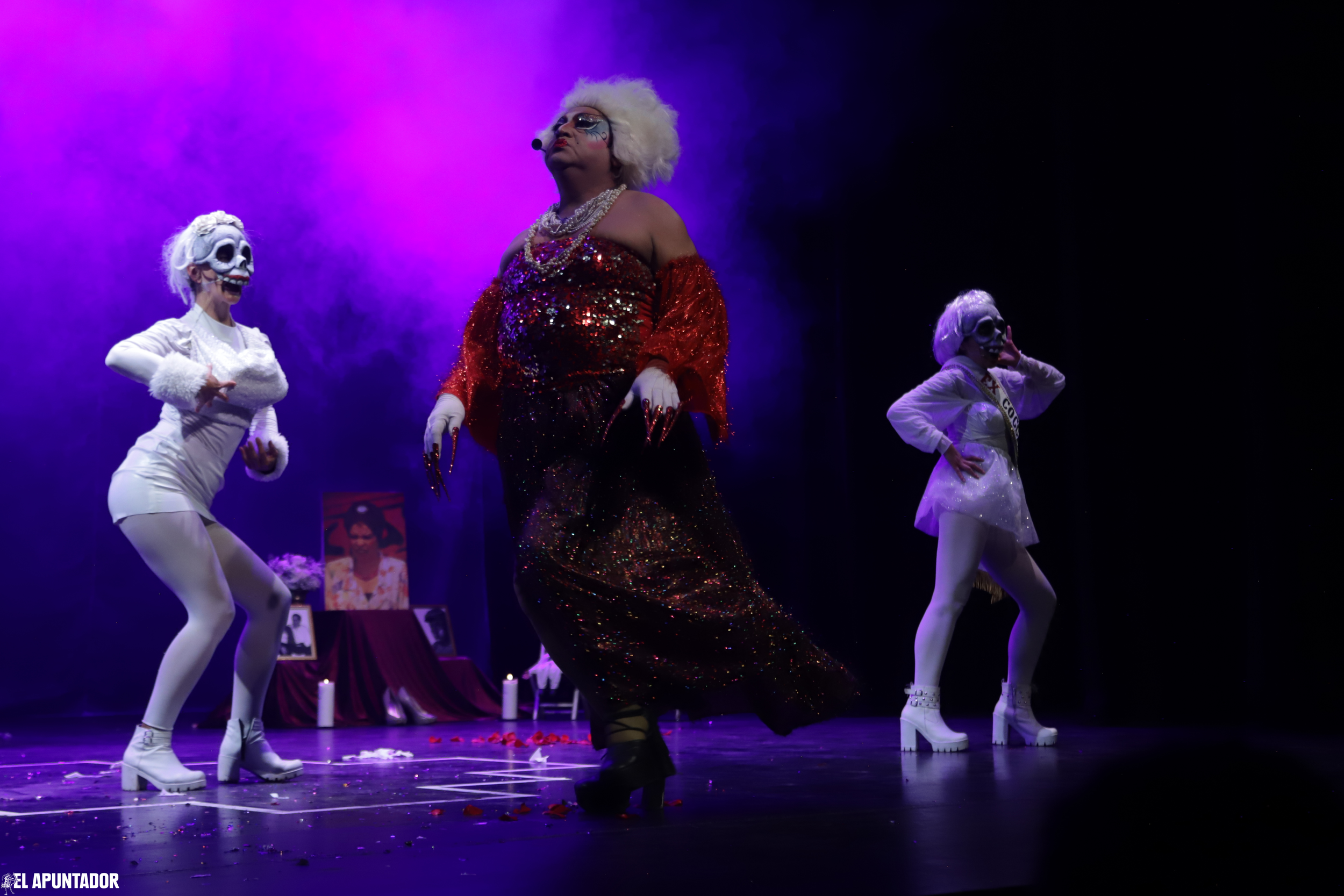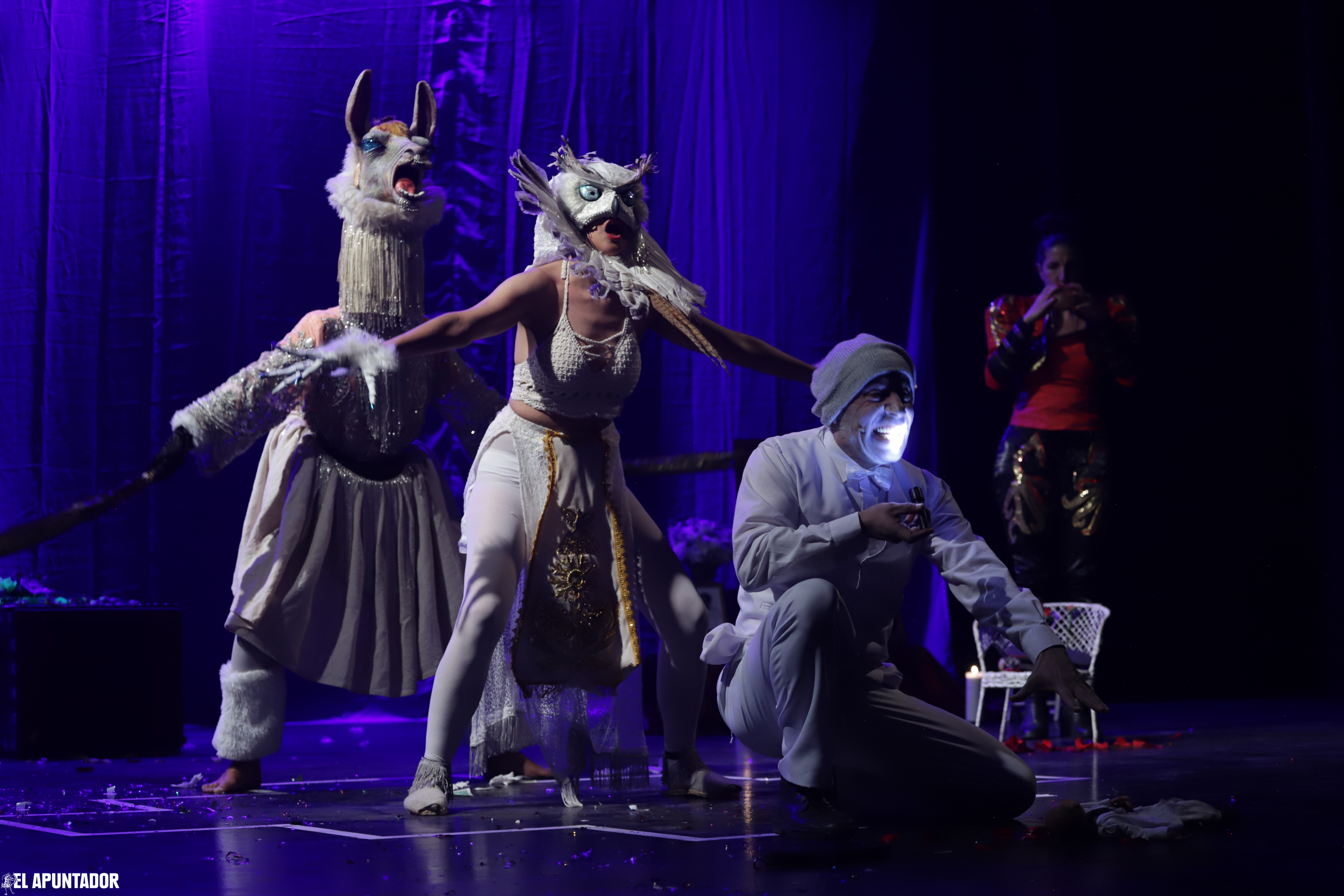 El performance popular es residuo hecho carne, transmitido entre generaciones, es un medio para permanecer y no olvidar. La idea del original se vuelve mítica y los restos, la carne, el lugar de la memoria colectiva (Schenaider en Taylor, 2011). La dualidad de la vida y la muerte se encarna entre el teatro y el actor. Varias catrinas bailarán, tras máscaras oscuras o fantasmales, probablemente Natalia Ortiz y Adriana Camacho, personificando a la fiesta que nos acerca a los muertos cuando visitan a sus quereres. Una llama se ha puesto alas, para recibir a los difuntos, en uno de los tres mundos que puede habitar, un búho sabio, imagen ligada a los ancestros, también escolta a los artistas que van llegando.