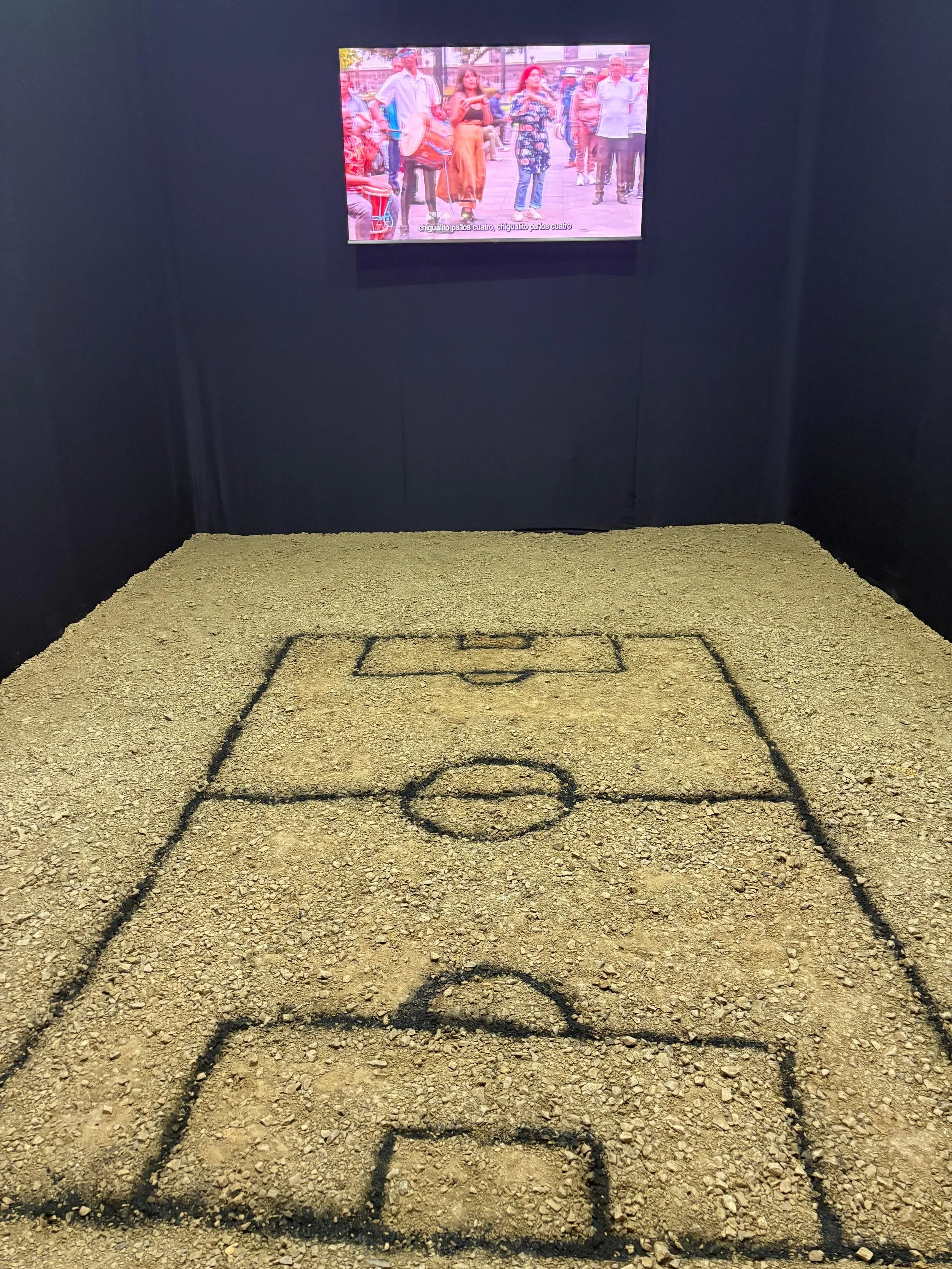 Si bien la instalación nos golpea fuerte a través de una cancha de fútbol armada sobre arena, hay tres vídeos en la misma sala que desvirtúan el resultado global.