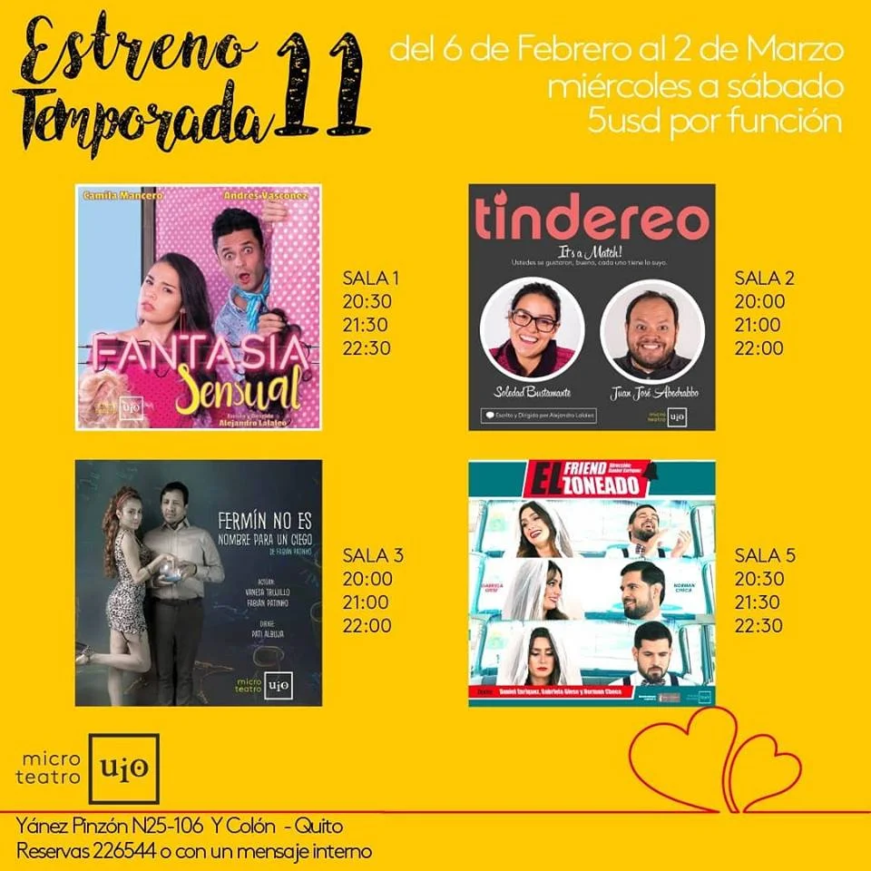 ESTRENO TEMPORADA MICROTEATRO UIO Wednesday, February 6, 2019 8:30 PM 20:30 Saturday, February 9, 2019 8:30 PM 20:30 Microteatro UIO Yánez Pinzón N25-106 y Av. Colón Quito Ecuaodr (map) Google Calendar ICS